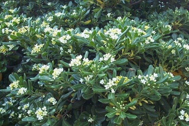 Αειθαλής θάμνος με σφαιρικό σχήμα. Έχει φωτεινό πράσινο φύλλωμα και αρωματική λευκή ανθοφορία τον Απρίλιο - Μάιο (Pittosporum tobira)